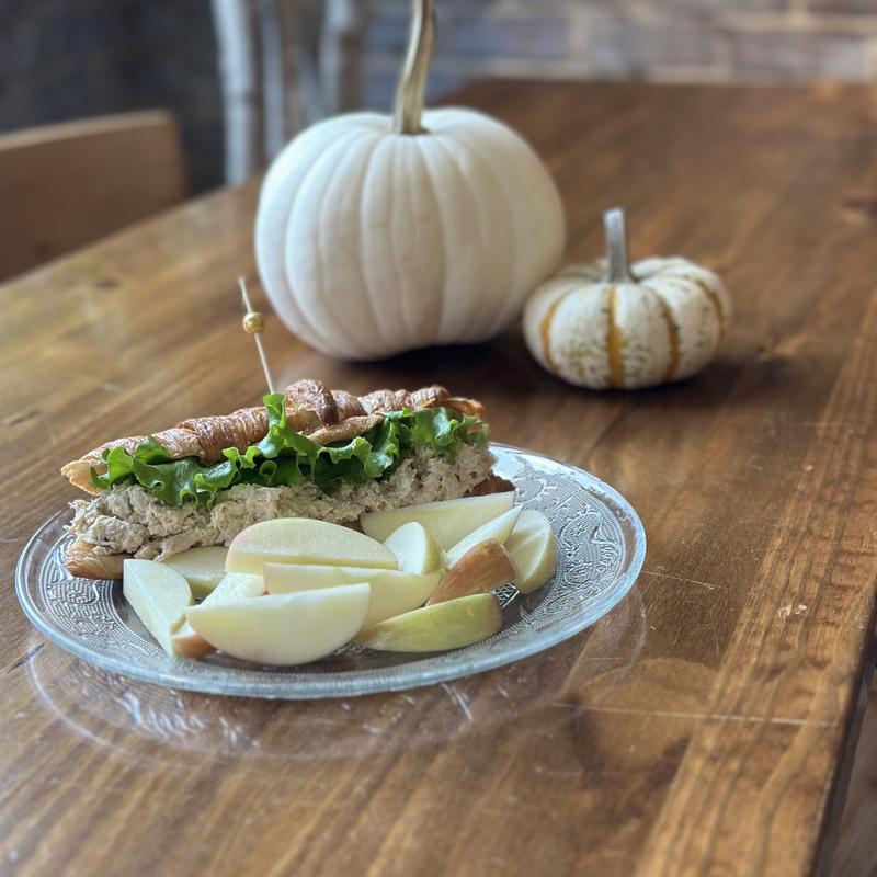 House made creamy chicken salad on a buttery croissant. Comes with a side of apples or grapes