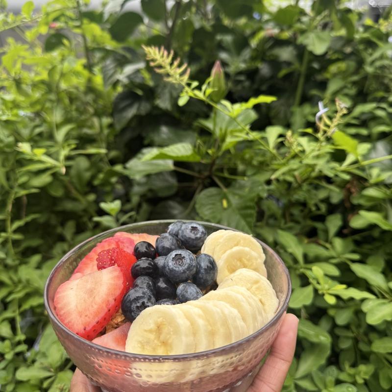 Acai sorbet topped with fresh berries, banana, granola and a drizzle of honey.