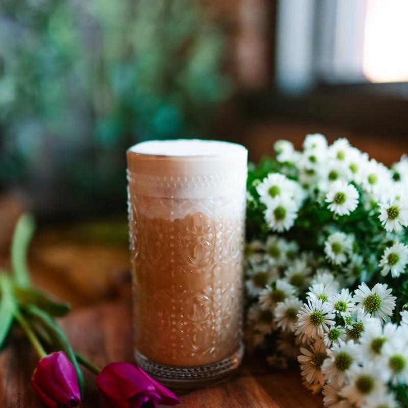 Iced latte with Toasted Marshmallow, Vanilla, and hazelnut syrup with your choice of milk topped with White chocolate cold foam.