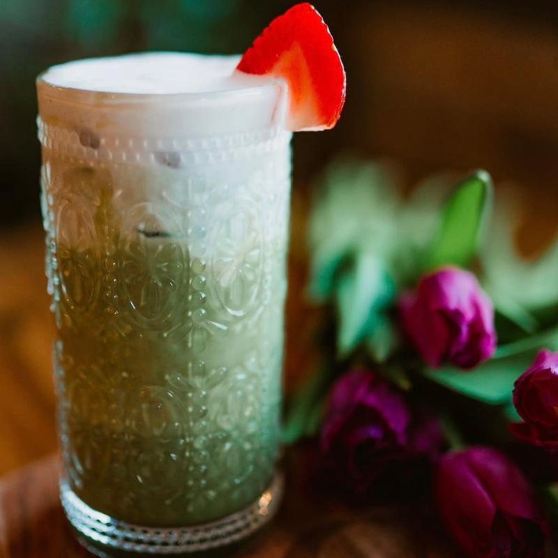 Iced matcha latte with Strawberry and Pistachio syrup with your choice of milk topped with Strawberry cold foam.